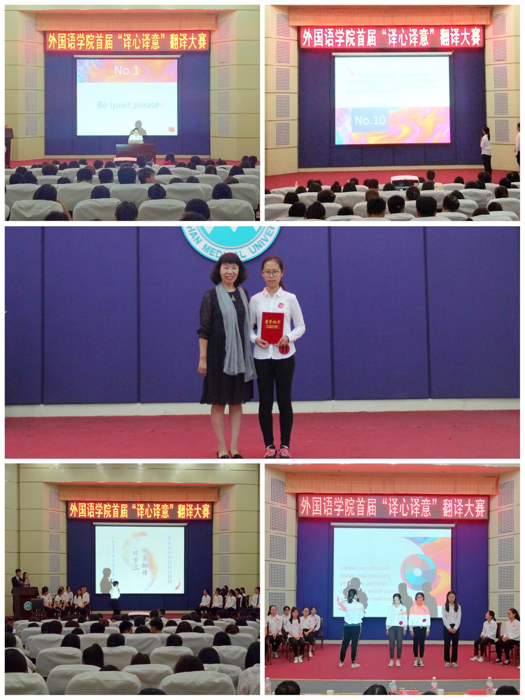 比赛在一段活力十足的歌舞剧《schnappi》中拉开帷幕。经过初赛和复赛的层层选拔,共有19位选手成功晋级到决赛。大赛共分传声筒、词条翻译、绕口令和交替传译四个环节。在传声筒环节,选手们中英文交替传译,体现了团队之间的默契配合程度;词条翻译对选手们的单词基础和热点词汇的掌握情况进行考察;绕口令环节选手们自信满满,向大家展示了出色的口语表达能力;最后的交替传译环节对选手们的心理素质和应变能力提出了较高要求,选手的精彩表现得到了评委老师的充分肯定。中场舞蹈《latata》以及最后的歌曲《平凡从医路》体现了青春的跃动与张扬,感染着在场的每一位观众。最终,11号选手王映雪以出色的表现荣获一等奖。