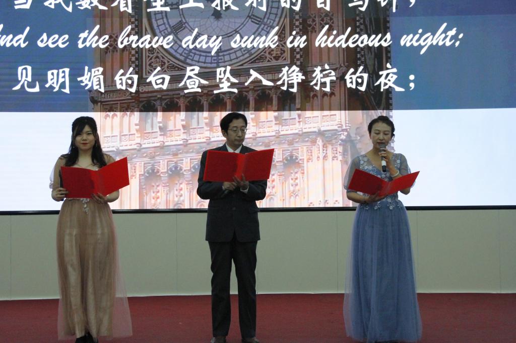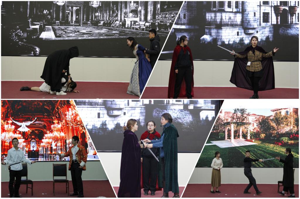莎士比亚戏剧是人文主义巨著,是世界文明的瑰宝。今年是莎士比亚诞辰455周年,重温这位伟大作家的作品,领略莎翁精妙的言辞和深邃的思想,使每一位戏剧节的参与者和观众都受益匪浅。晚会在一段优美动听的音乐中正式拉开帷幕。张勇老师、刘婷老师和赵晓颖老师带来的诗朗诵《The Song of Ice and Fire》引领观众走进莎士比亚的戏剧世界。