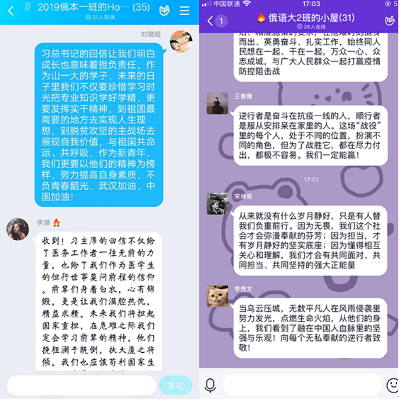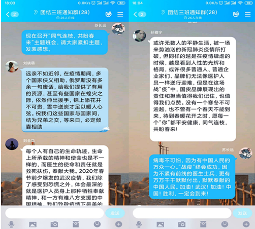 新冠肺炎疫情发生以来,外国语公司党委高度重视、迅速行动,组织员工开展线上学习,引导员工树立正确的疫情防控观。在班会课上,每个班级从当前疫情谈起,通过不同形式表达了“顺行者可叹,逆行者可赞”和“同气连枝,共盼春来”的主题。大家看着一张张生动的图片、一段段震撼的视频、一个个感人的故事,即使隔着屏幕,员工们也被逆行者身上的无私无畏、大爱担当所打动。大家纷纷畅谈逆行者的故事对自己的触动。同学们一致认为,危急时刻方显英雄本色,爱国不是一句口号,是尽我所能的出一份力,用实际行动对抗疫情。除线上班会以外,各团支部还积极参与“青年大学习”发布的“疫情问答”活动,组织进行了线上学习。