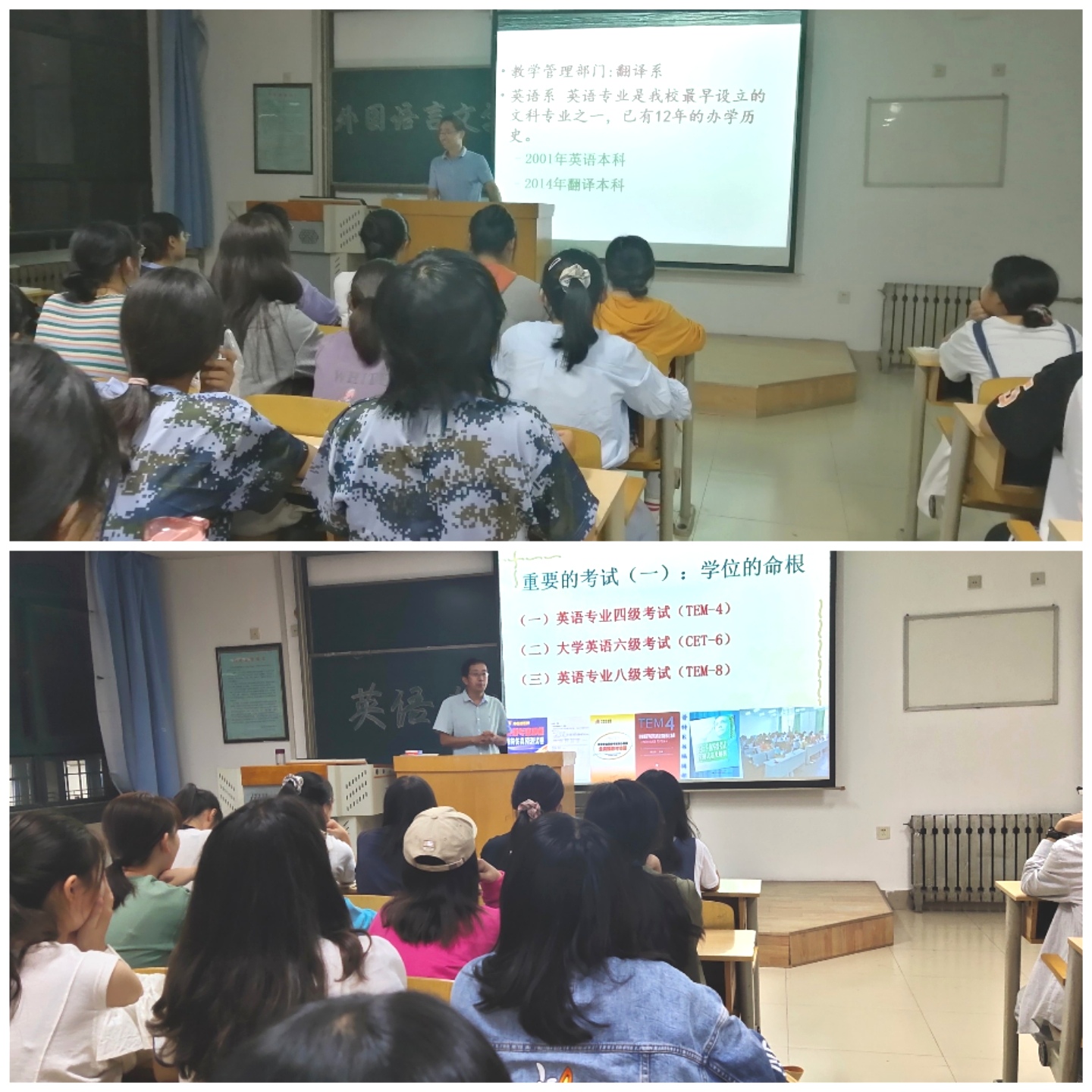 翻译系主任祝远忠就外国语言文学类专业为同学们做了详尽讲解,讲解了英语与翻译两个专业方向的相同点和不同点,建议同学们先学好基础知识,再根据自己的兴趣爱好选择专业方向,并就学分制选课、考研、出国留学等问题,为同学们做了逐一解答。
