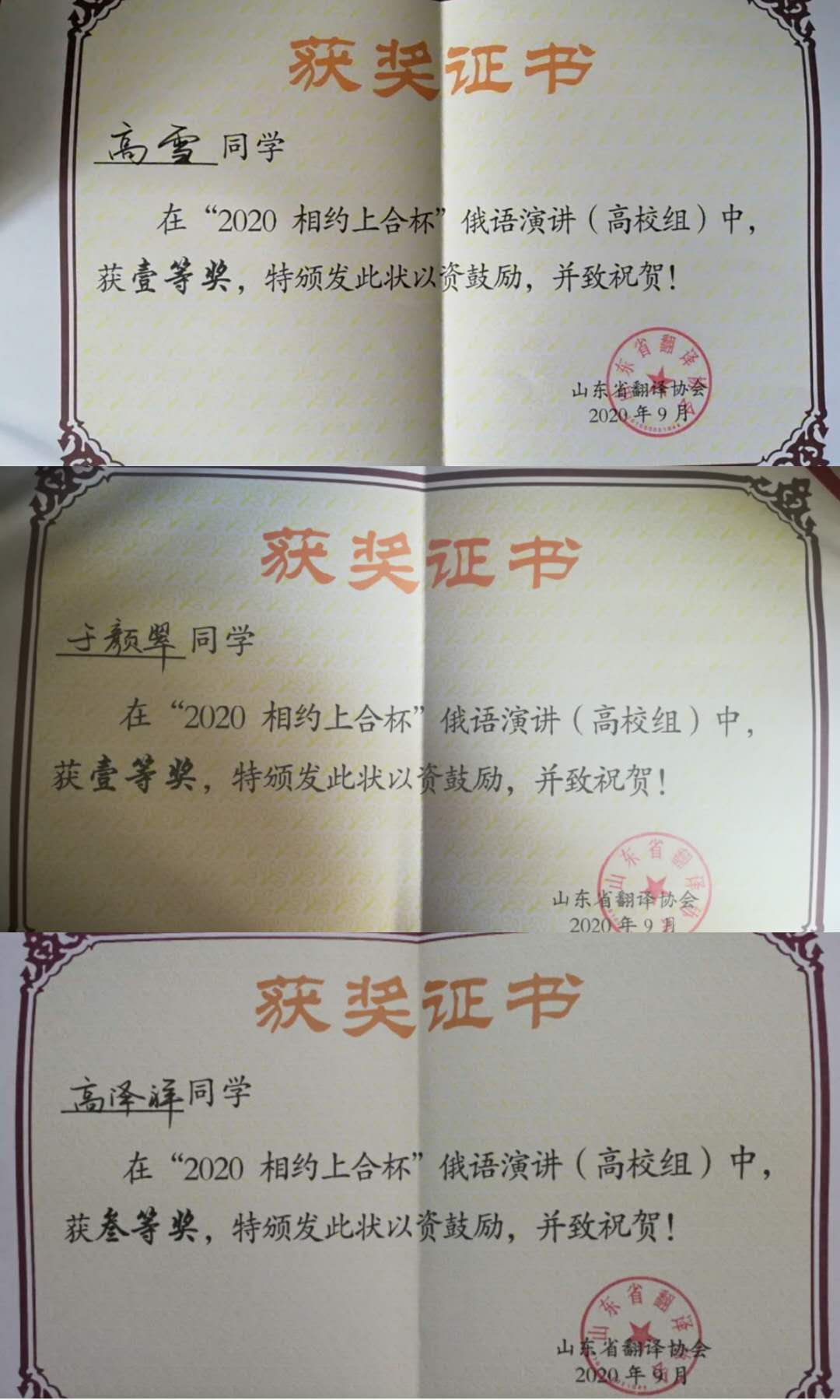 2020年9月25日,山东省首次自主举办的2020“相约上合杯”俄语演讲比赛(高校组)在济南举行。来自山东省内31所高校的84名员工齐聚济南,共享这一俄语届盛事。球王会俄语系选派的高雪同学和于颜翠同学以良好的语言面貌和饱满的热情在众多选手中脱颖而出,分获两项一等奖;高泽祥同学荣获三等奖。另外,公司还获得组委会颁发的“大赛优秀组织单位”奖。