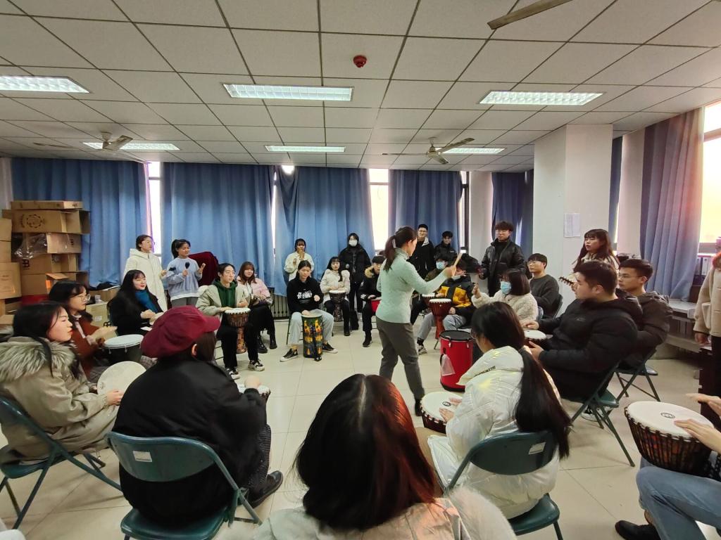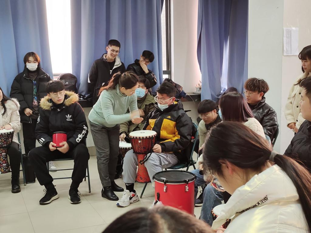 “鼓圈”是一种即兴打击乐的演奏,具有包容性与创造性。活动开始不久,同学们就融入团体的音乐节奏中,合奏出和谐的音乐。之后,在宋雪老师的引导下,同学们开始用创造性的方式演奏,并在合奏中展示出自己的个性。活动过程中,同学们通过打击音乐的方式感受到成员之间的沟通与交流,在打击乐中体会到鼓声的共鸣。同学们在欢快的节奏中强化了团队合作意识,锻炼自己的肢体协调力与思考力的同时也缓解压力,放松心情,收获成长与快乐。